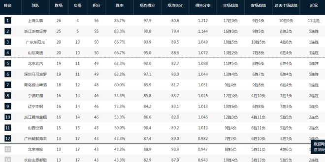 上海目前26胜4负高居联赛第一,他们正打出一波11连胜无可阻挡。哪怕上海市剩余12场全输,也拥有26胜16负战绩,积分将达到68分。