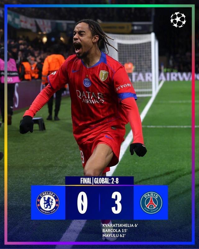 切尔西次回合回到主场,0-3不敌巴黎再次遭遇惨败。克瓦拉茨赫利亚、巴尔科拉、马尤卢各入一球,巴黎两回合总比分8-2横扫轻松挺进八强。